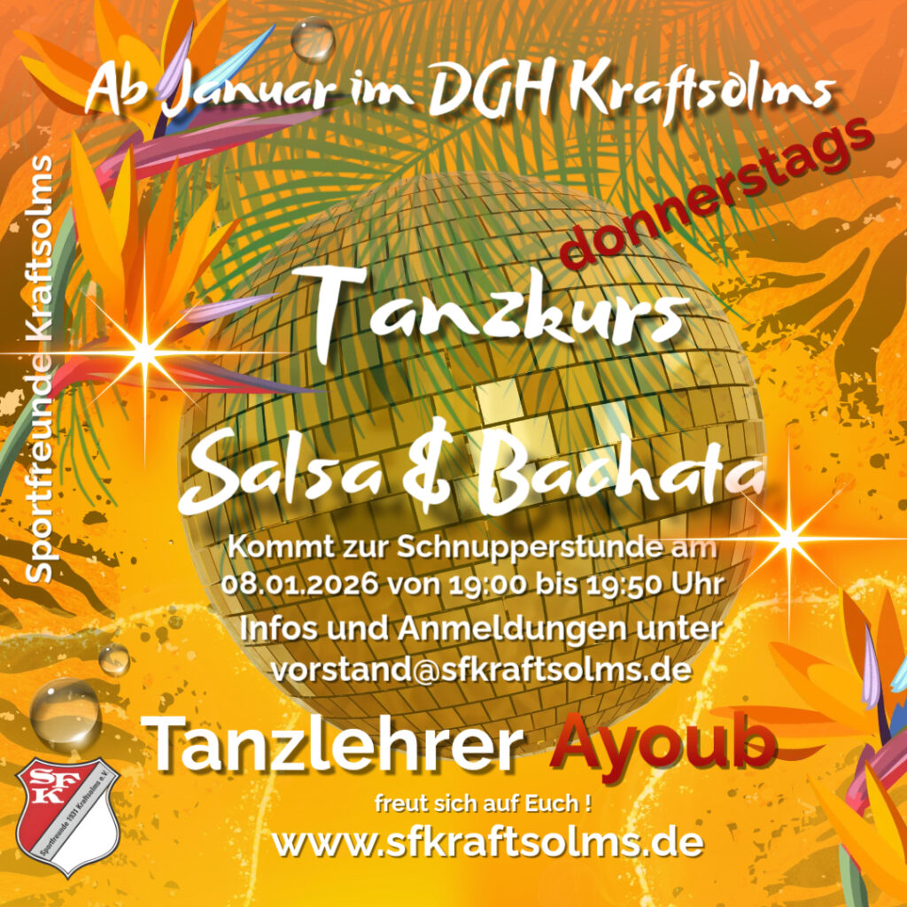 Ab Januar soll neben dem „Mittelkurs“ Salsa und Bachata, der von 18:00-19:00 Uhr stattfindet, ein neuer Anfänger Tanzkurs Salsa und Bachata donnerstags von 19:00-19:50 Uhr mit unserem Tanzlehrer Ayoub im DGH Kraftsolms stattfinden. Der Kurs beinhaltet 10 Einheiten à 50 Minuten.