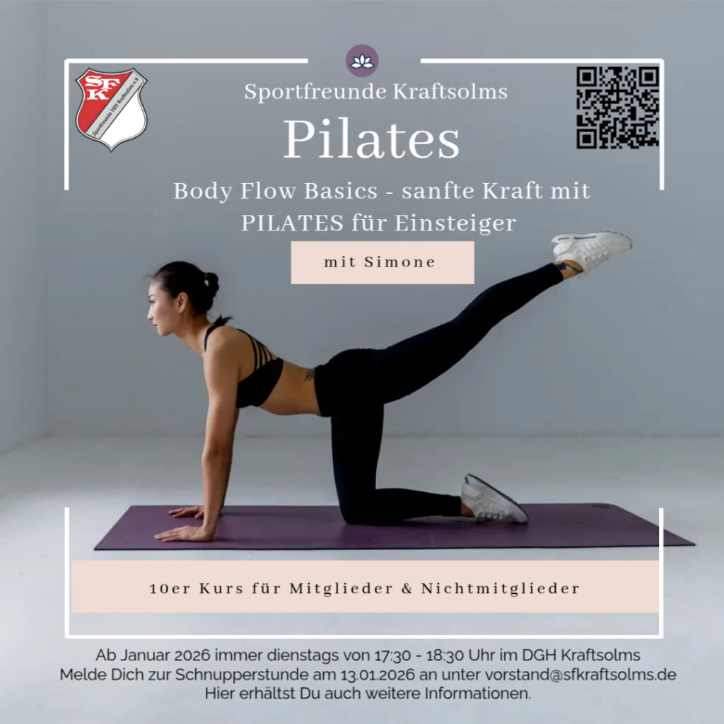Unsere qualifizierte Trainerin Simone wird dienstags von 17:30 – 18:30 Uhr im DGH Kraftsolms einen Pilates-Kurs mit jeweils 10 Kurseinheiten anbieten.